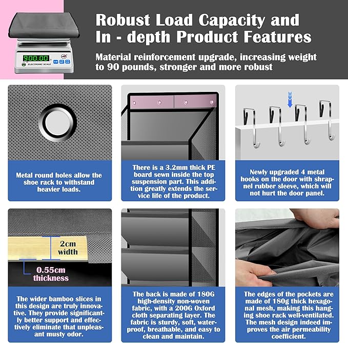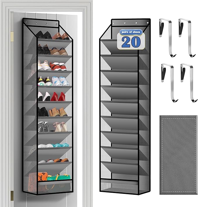- 【Durable and User-Friendly Design】: This over-the-door hanging shoe rack is made of sturdy Oxford cloth and mesh cloth, with much higher durability than ordinary non-woven shoe racks. The mesh cloth is made of breathable material, which is not only tear-resistant but also easy to clean. Each layer has excellent load-bearing capacity and can hold at least 20 pairs of shoes when placed flat. It is very suitable for heavier or larger footwear such as high heels and boots, and will not deform even after long-term use. The slanted opening pocket design ensures easy access to items, enhancing your daily convenience.