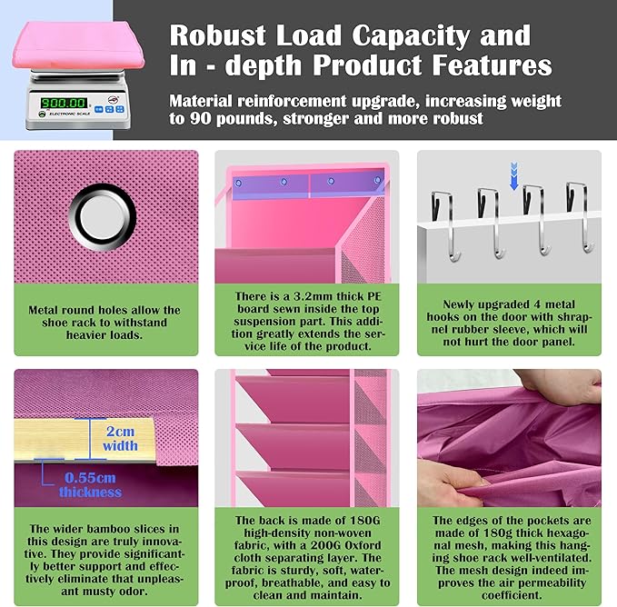 - 【Durable and User-Friendly Design】: This over-the-door hanging shoe rack is made of sturdy Oxford cloth and mesh cloth, with much higher durability than ordinary non-woven shoe racks. The mesh cloth is made of breathable material, which is not only tear-resistant but also easy to clean. Each layer has excellent load-bearing capacity and can hold at least 20 pairs of shoes when placed flat. It is very suitable for heavier or larger footwear such as high heels and boots, and will not deform even after long-term use. The slanted opening pocket design ensures easy access to items, enhancing your daily convenience.