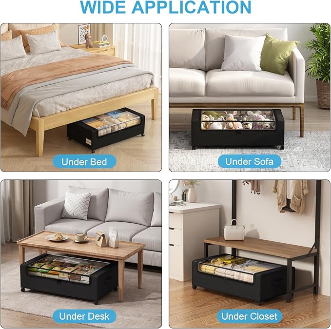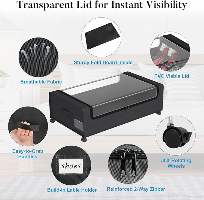 - See & Grab in Seconds: Never dig blindly again! Our underbed storage features a transparent top lid, so you instantly spot holiday sweaters or baby supplies. Dual zippers open smoothly from both sides, while reinforced handles and label tags make retrieval a one-tug wonder.