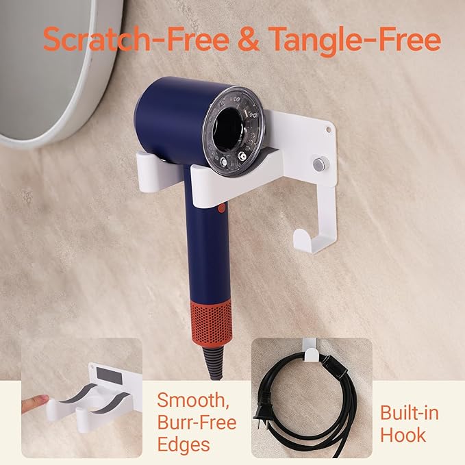 - 【Universal Compatibility】This hair dryer holder fits all blow dryer holder models including Dyson hair dryer holder, Conair, Revlon & more! The adjustable silicone grip accommodates various sizes while the non-slip base keeps your hair dryer stand secure on any smooth surface.