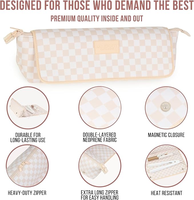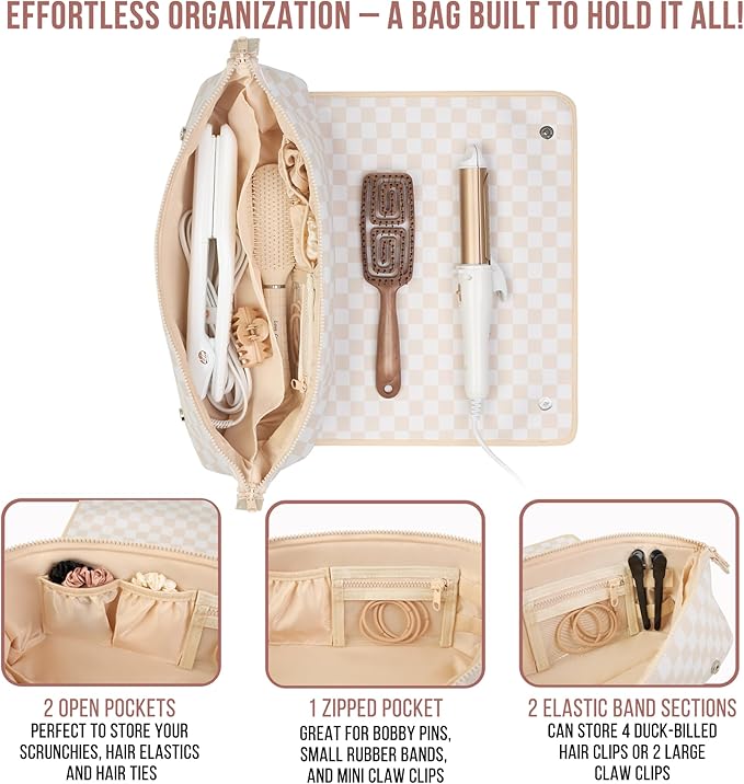 - Versatile Interior Storage Pockets – Our curling iron holder features two interior pockets, one zippered pocket, and two elastic band sections for hair clips to keep all your hair essentials in one place at home or when you’re traveling.