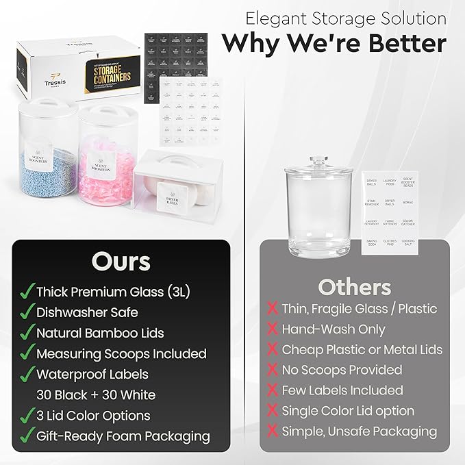- 3 PIECE LAUNDRY AND BATH STORAGE AND ORGANIZATION SET: Includes two 3 liter glass jars and one acrylic dryer sheet holder, each with a secure lid. Designed to store laundry pods, powder, laundry booster beads, dryer balls