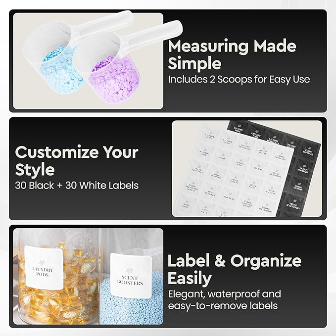 - MEASURING MADE SIMPLE: Each laundry soap container set includes two clear scoops with etched measurement lines for accurate portioning