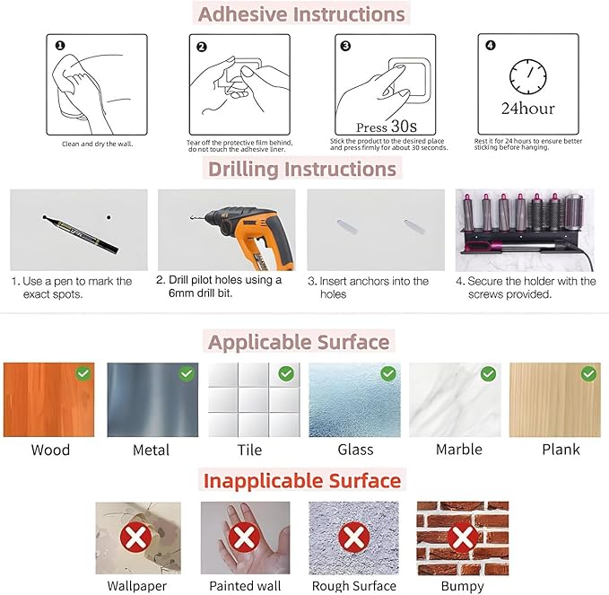 - ✅【Dual Mounting Options – Self-Adhesive or Screws】Choose quick installation with strong adhesive pads or secure screws. This versatile Airwrap holder wall mount and plugpro hair tool holder adapts to tile, wood, or drywall surfaces with ease.(Note:Adhesive option is NOT suitable for rough surfaces, painted walls, or wallpaper)