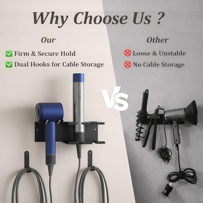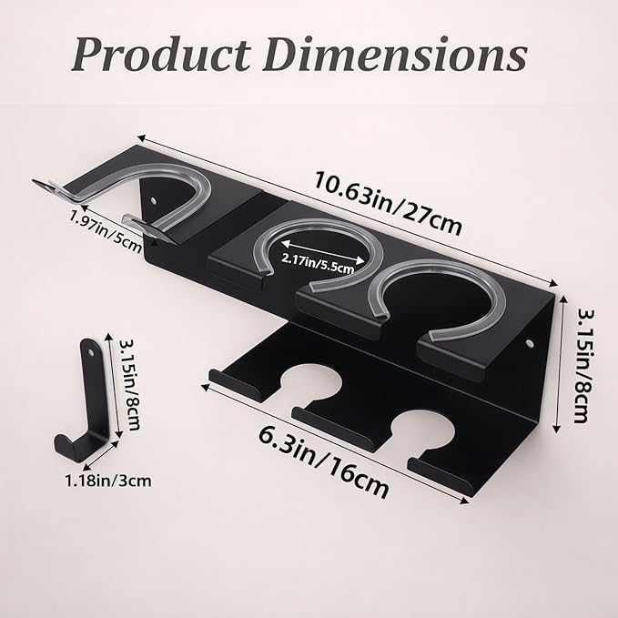 - 【Universal Compatibility for 99% of Styling Tools】 Designed to fit 99% of hair dryers and curling irons on the market, including the Dyson Airwrap. This versatile Dyson hair dryer holder also functions as a secure straightener holder, keeping your styling tools safely stored, organized, and easily accessible.