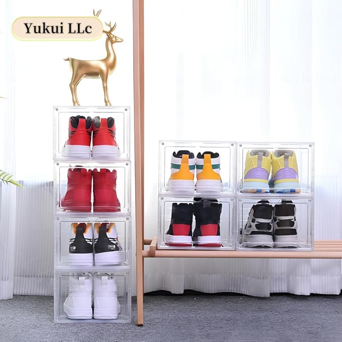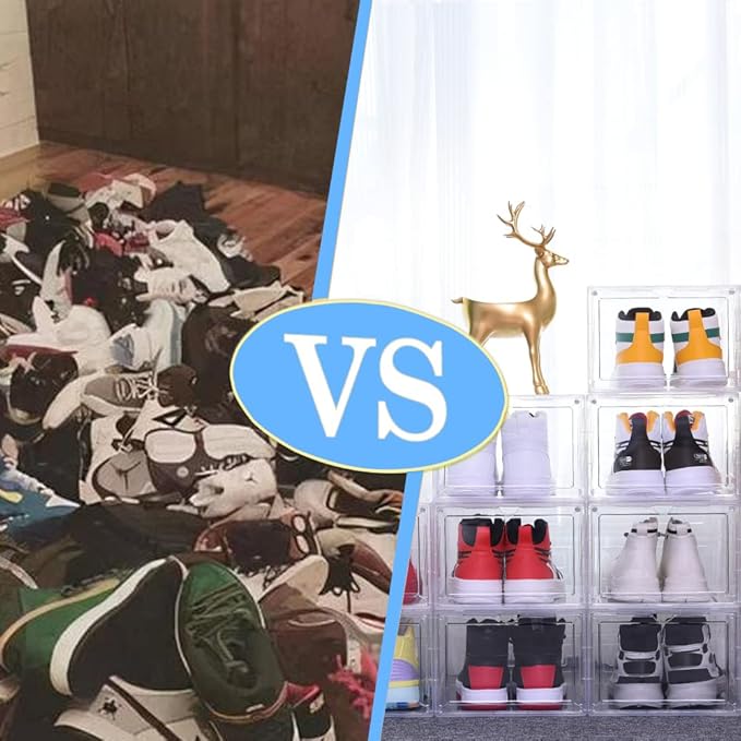 - Crystal Clear Display and Organization: This clear plastic stackable shoe storage boxes are designed to provide complete visibility of stored footwear, allowing for instant identification without opening the magnetic doors. Made from durable, heavy-duty plastic, these boxes are both waterproof and washable, ensuring they can withstand regular use and protect shoes from dust, moisture, and other environmental elements. The transparent design not only serves a functional purpose but also adds an aesthetic element, creating a sleek display case effect that transforms ordinary shoe storage into an organized showcase