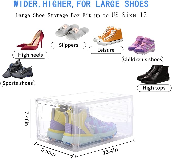 - Spacious and Versatile Storage Solution: This clear plastic stackable shoe storage boxes are designed to accommodate shoes up to US men's size 12 and women's size 13. With interior dimensions of 13.4 x 10.6 x 7.4 inches, these containers provide adequate space for most standard athletic shoes and sneakers. However, the 7.4-inch height limitation means they are primarily suitable for regular-height footwear rather than tall boots or high-top basketball shoes. The rectangular design works well for organizing dress shoes, casual sneakers, and low-profile athletic footwear, making them ideal for everyday shoe storage needs