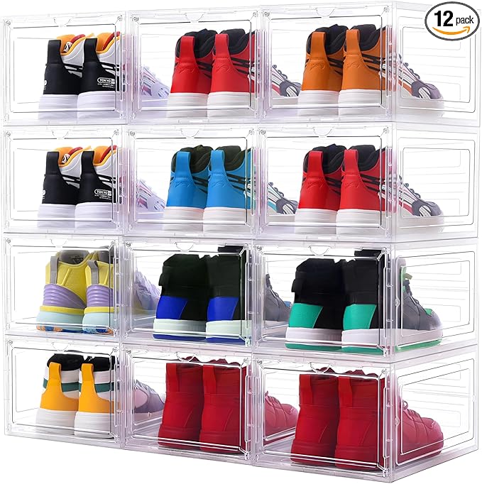 Large Clear Shoe Storage Boxes 12 Pack Stackable, Drop Front Magnetic Door Shoe Organizer with Plastic Sneaker Display Case Containers Transparent Shoe Rack for Closet Organization Fit US Size 12