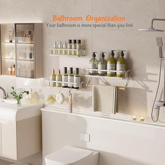 - 4. 【STURDY & DURABLE METAL RACKS】 Durable White Spice Rack , Made By Premium Sturdy Carbon Steel Construction And Doulbe Layer Power Coating Ensure Waterproof And Rust -Resistant ,Securely Holds Shampoo Bottles And Heavy Spice Jars, Hanging WallMounted Bathroom Metal Racks Organizers in High-Moisture Areas also are Durable