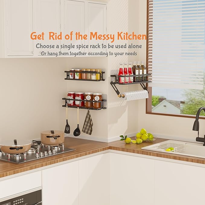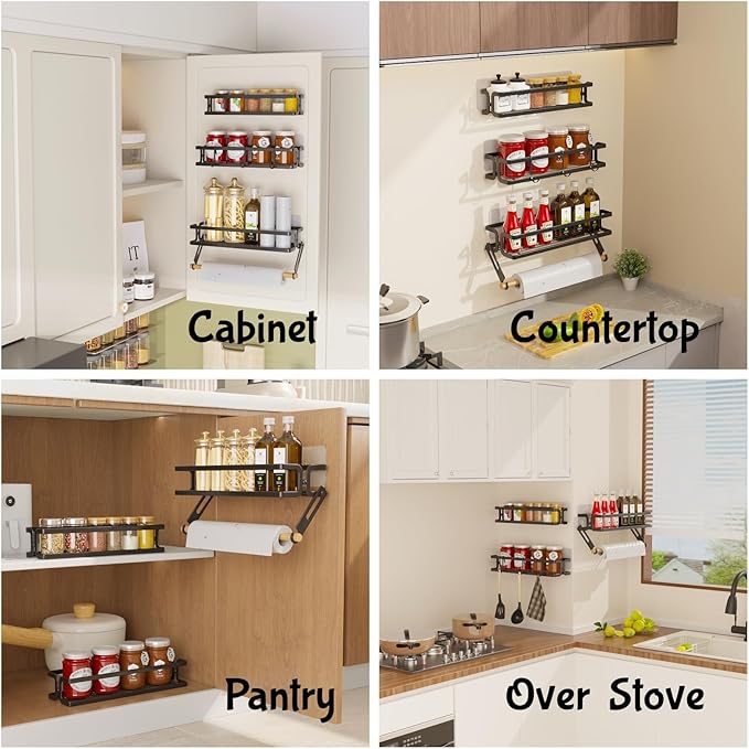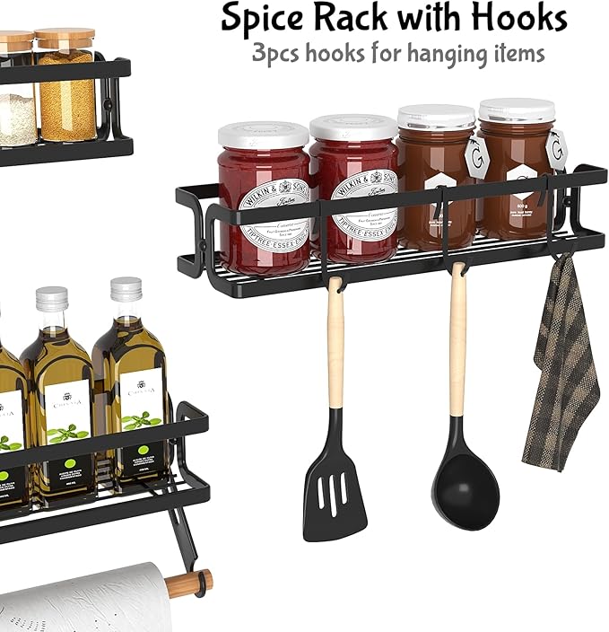 - 1. 【 HANGING SPICE RACK FOR WALL 】Wall Mounted Spice Rack with Utensil Hook and Paper Towel Holder for Countertop, 3 Sizes Seasoning Rack Meet All your Home Needs. - Small Spice Rack For Narrow Space and Smaller Size Jars ... - 3pcs Removable Hooks for Hanging Kitcen Utensil Or Bathroom Accessories - Large Spice Rack with Paper Towel Rack for High or Big Bottles