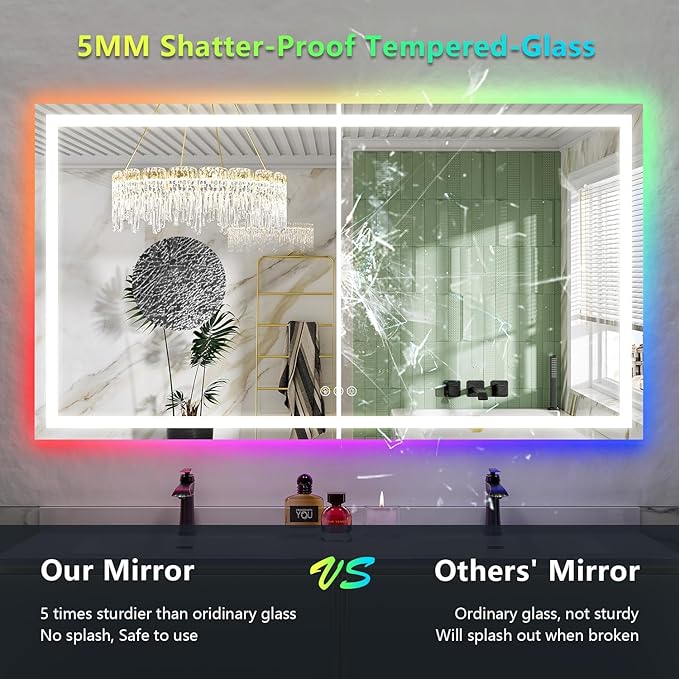 - 💎【3+8 Light Colors, Make a Difference】- This led mirror for bathroom has 3 front light modes: warm(3000K), white (4000K) and cold (6000K). RGB backlit has 8 light modes: warm / white / cold / flowing colorful / purple / red / green / blue. THE BACK LIGHT CAN BE WHITE ONLY! The muli color tone options are what makes this led vanity mirror and what makes your bathroom truly difference.