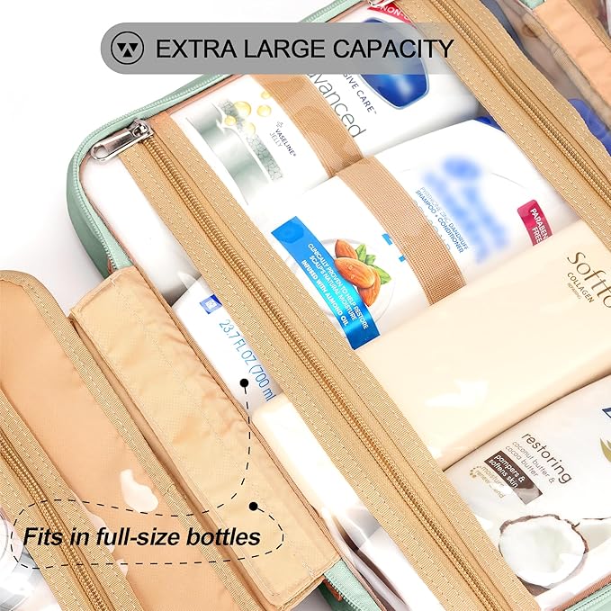 Travel Hanging Toiletry Bag for Women, Cruise Ship Essentials, with Jewelry Organizer, Extra Large Makeup Dopp Kit, Waterproof Cosmetic Bags, Toiletries Kit Set with Trolley Belt, Green