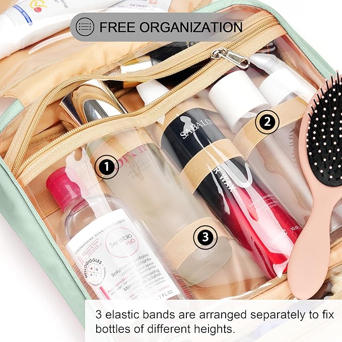 - CONSIDERABLE DESIGN - The elastic bands inside the two main compartments can keep the different height bottles fixed and upright. Your comb, toothbrush, razor, and leak-prone makeup can all go in there, even a hair dryer. 360° metal hook gives you a variety of hanging options.