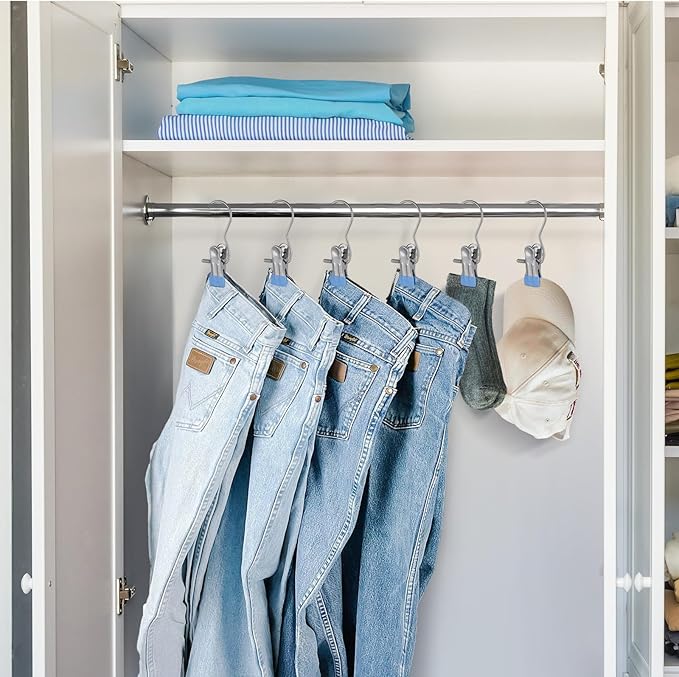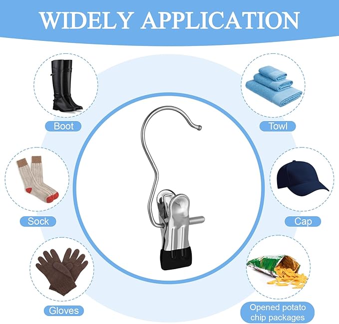 - 【Multi-function Hanger Clips】Stainless steel hanger clips for organizing , slacks, jeans, skirts, boots, hats, handbags, towels, and more. Suitable for indoor and outdoor drying. Its multi-functional design simplifies your organizing tasks.