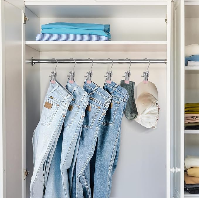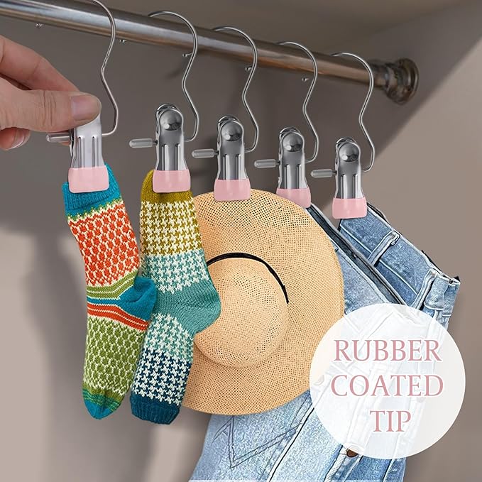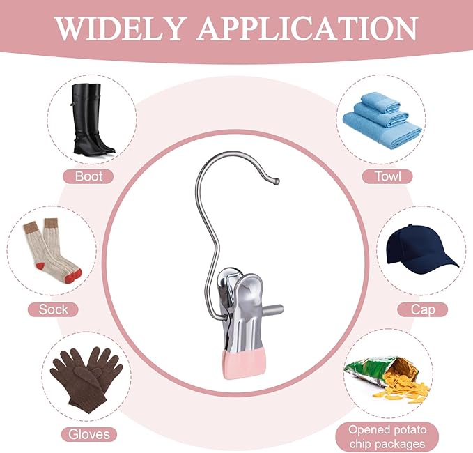 - 【Multi-function Hanger Clips】Stainless steel hanger clips for organizing , slacks, jeans, skirts, boots, hats, handbags, towels, and more. Suitable for indoor and outdoor drying. Its multi-functional design simplifies your organizing tasks.