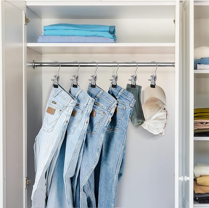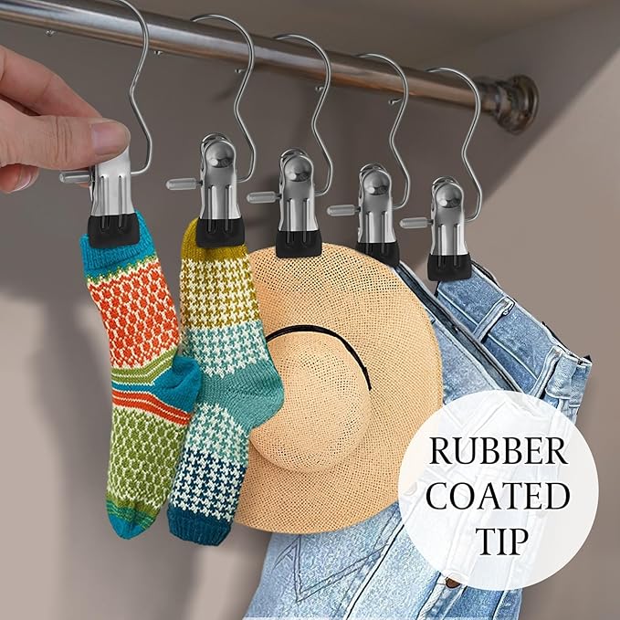- 【Multi-function Hanger Clips】Stainless steel hanger clips for organizing , slacks, jeans, skirts, boots, hats, handbags, towels, and more. Suitable for indoor and outdoor drying. Its multi-functional design simplifies your organizing tasks.