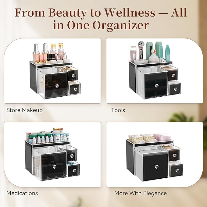- 【Smoky Glass with Silver Frame】 Featuring premium smoky glass accented with a sleek silver frame, this organizer delivers a modern, understated luxury that complements contemporary spaces.