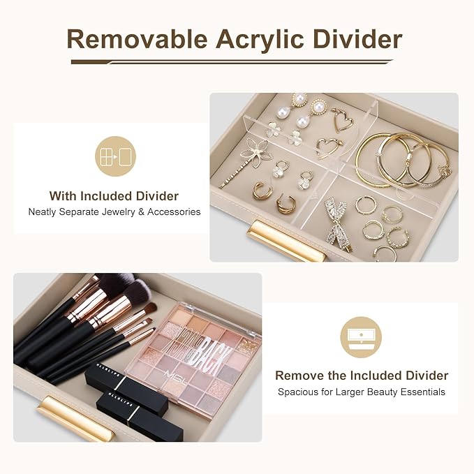 - 【Customizable Drawer Organizer】 Comes with a removable acrylic cross divider for the drawer, so you can organize the jewelry or small accessories by category, or remove it for larger items. Flexible storage that adapts to your needs.