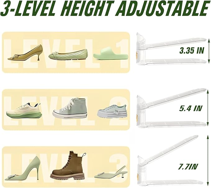 - THREE LEVELS HEIGHT ADJUSTABLE: You can flexibly adjust the height of the shoe slot from 3.7‘’ to 7.7‘’, this shoe slot organiser is suitable for most shoes, it is suitable for slippers, high heels, trainers, leather shoes, ankle boots, hiking boots, stiletto heels and children's shoes. Provides an excellent space-saving solution for bedrooms, wardrobes and shoe racks.