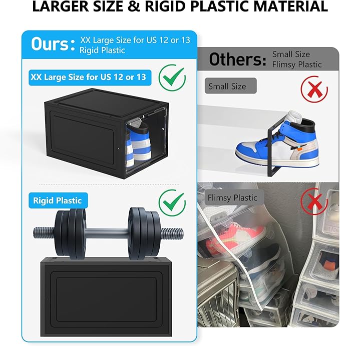 - Upgraded Hard Shoe Boxes:Say goodbye to soft plastic shoe boxes! Made of from sturdy hard plastic on all six sides, our shoe boxes boast exceptional durability and load-bearing capacity. Additionally, their transparent design ensures easy viewing of your shoes.