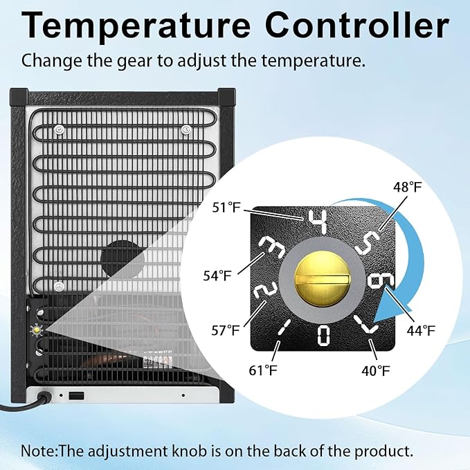 - Temperature Control: Supports temperature adjustment(at the back of the product), and the appropriate temperature can be set according to the needs of stored items (such as beverages, cosmetics).