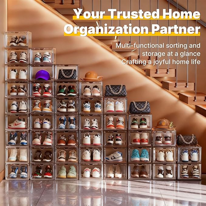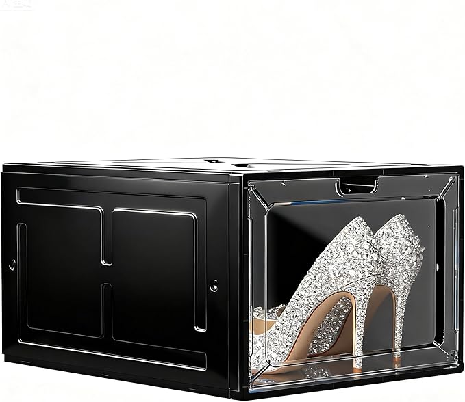 - ✔Minimalist Black Box with Clear Magnetic Front Door – The solid black body delivers a sleek, professional look, while the high-clarity thickened front door allows you to clearly see shoe colors and styles. Magnetic door design makes access easy without unstacking.