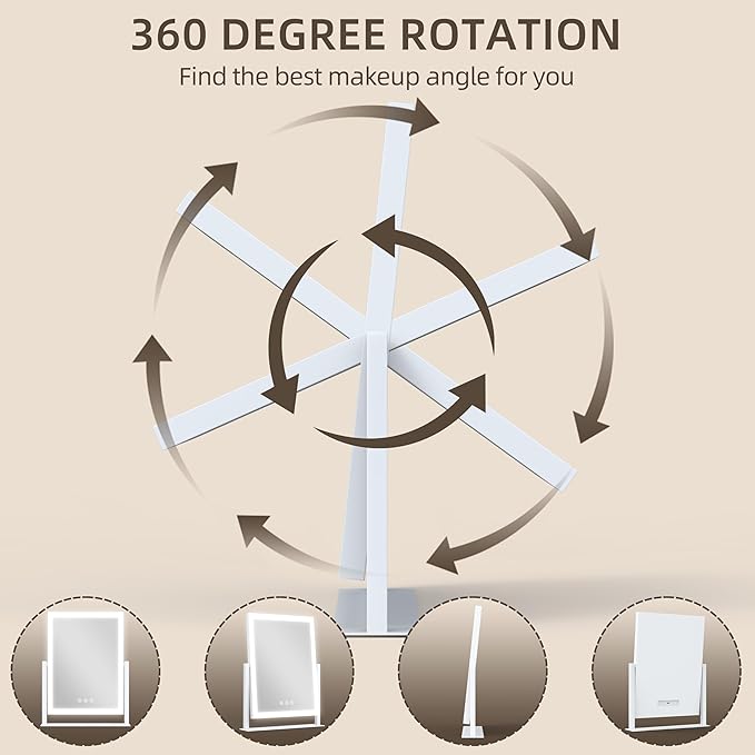 - đ¸ăMinimalistic Rounded Designă The vanity mirror 17"x13"with provides a perfect upper body view. 360° rotation LED makeup mirror Adjust the mirror's angle effortlessly with its smooth swivel and tilt mechanism, ensuring you achieve the perfect viewing position every time