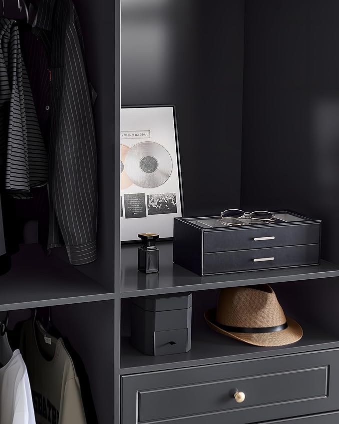- 12-Compartment New Vertical Display Drawer-Style Storage: Upgraded capacity in a more compact size for more efficient sunglasses organization