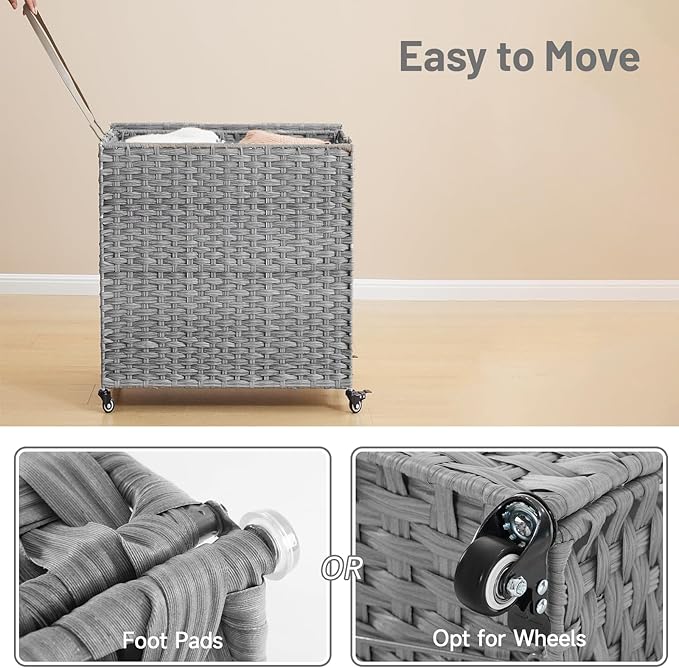 - Easy to Move: This rolling laundry hamper has 4 wheels (2 have brakes), the pu leather handles side of the basket cart enable you to pull it wherever you want with ease. Added pu decorative handles, make the lid easy to open and the rattan lid protect your clothes from dust and puppy's playing
