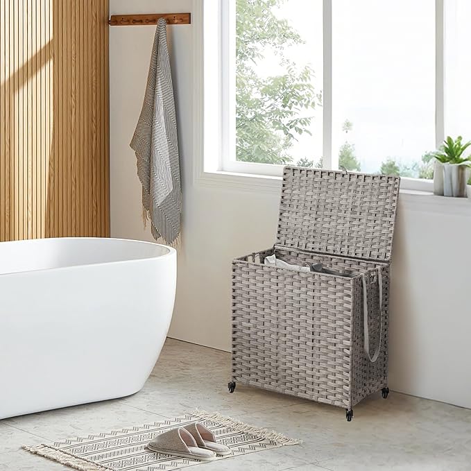 - Durable Materials & Handmade: This rolling laundry basket is made of a sturdy steel frame and synthetic rattan, which is stable, waterproof, breathable, and can stay dry in humid environments. Bright natural veneers and delicate weaving is suitable for any style of furniture design, The elegant rattan look is suitable for your bedroom, bathroom or laundry room, making the space more tidy and orderly