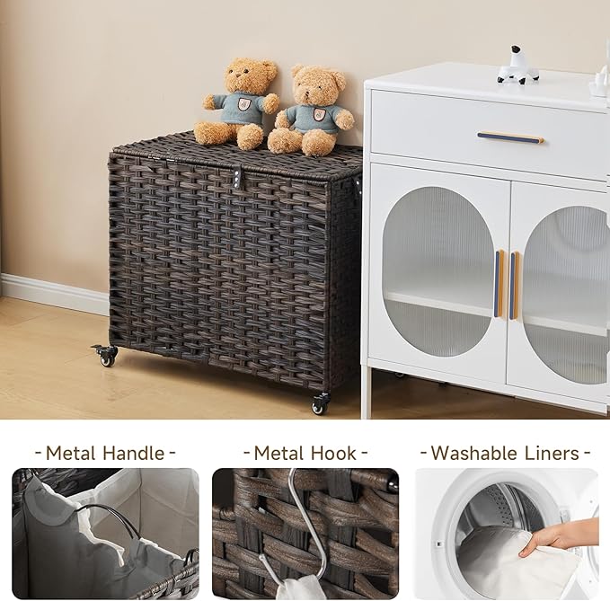 - Easy to Move: This rolling laundry hamper has 4 wheels (2 have brakes), the pu leather handles side of the basket cart enable you to pull it wherever you want with ease. Added pu decorative handles, make the lid easy to open and the rattan lid protect your clothes from dust and puppy's playing