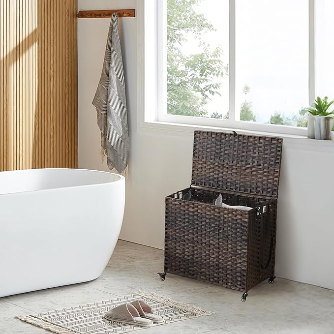 - Durable Materials & Handmade: This rolling laundry basket is made of a sturdy steel frame and synthetic rattan, which is stable, waterproof, breathable, and can stay dry in humid environments. Bright natural veneers and delicate weaving is suitable for any style of furniture design, The elegant rattan look is suitable for your bedroom, bathroom or laundry room, making the space more tidy and orderly