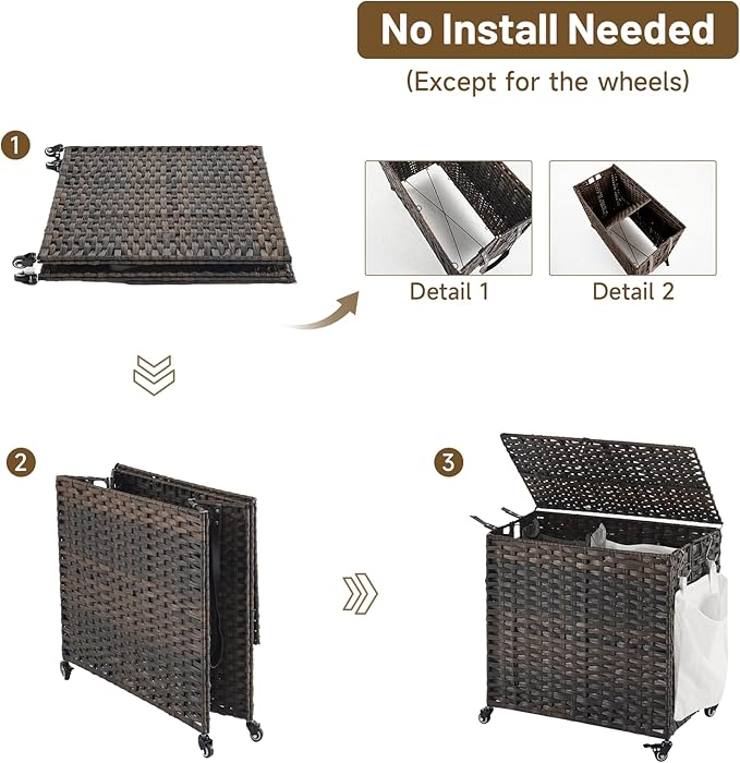 - No Install Needed: This laundry hamper with wheels are molded in one piece and no install needed (Except for the wheels). Foldable design of laundry sorter saves space and is easy to store and and transport, whether you're moving or not using it. Since it is handmade, each piece is unique