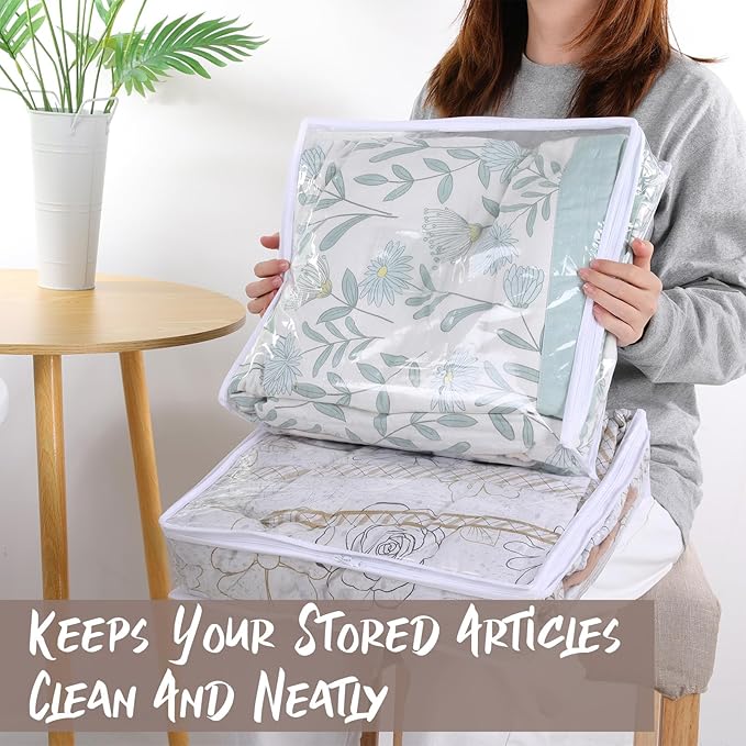 - 【Durable and High-Quality】These blanket storage bags are made from high-quality PVC material, designed to resist wear and tear, ensuring long-lasting use. The sturdy double-sided zipper provides easy access and a secure closure, making sheet organizers a reliable choice for organizing your belongings.