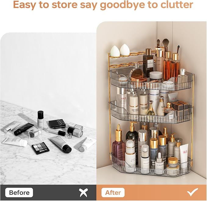 - SPACE-SAVING 90° CORNER DESIGN: Engineered for tight bathroom/vanity corners, Slim profile hugs walls without gaps, freeing sink area while holding 8” tall items like shampoo bottles or perfumes