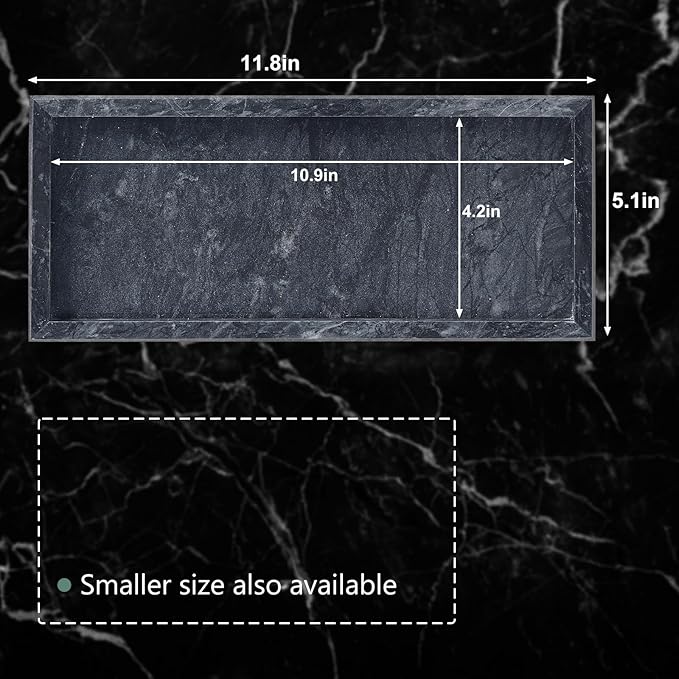 - Sleek & Sophisticated Profile: Designed with a modern aesthetic, our tray features a sleek, low-profile shape measuring 11.8” L x 5.1” W. This elegant proportion is perfectly suited for narrow countertops, vanity shelves, or dressers, providing a spacious surface for organization without occupying excessive space, blending seamlessly into your decor.
