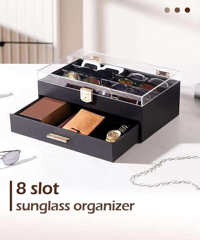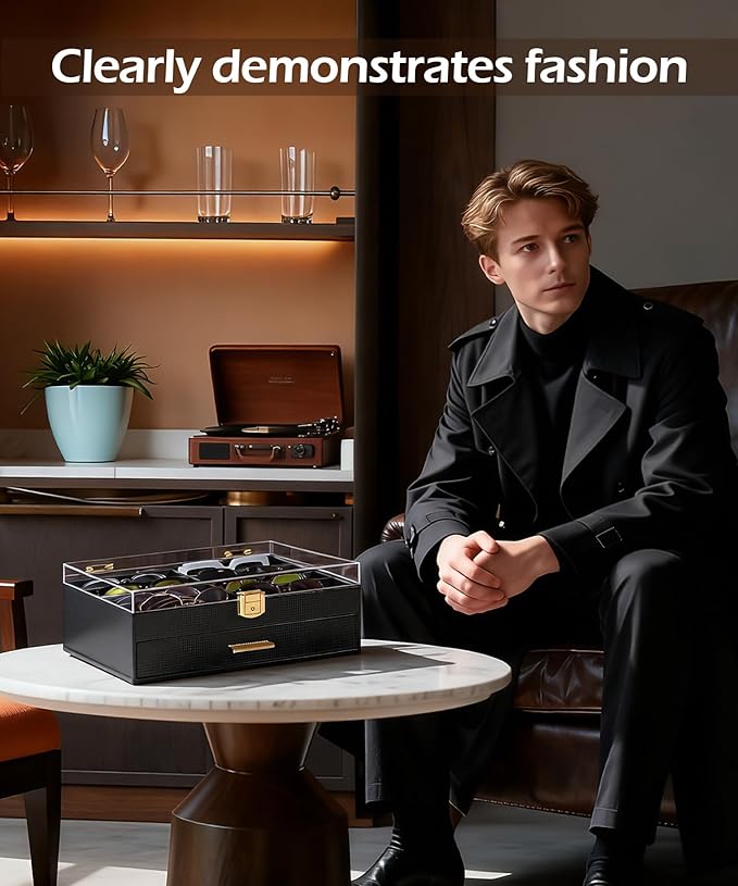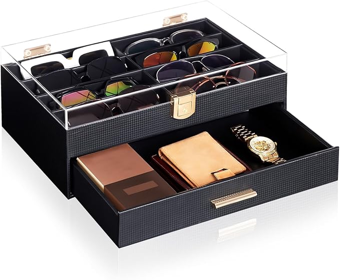 - This large carbon fibre glasses case features a 35x22x14 cm build with 8 dedicated slots and a deep drawer, offering ample storage for all your eyewear. The crystal-clear acrylic window and dust-proof design let you instantly view your collection while keeping glasses and jewelry safe from scratches and dust.