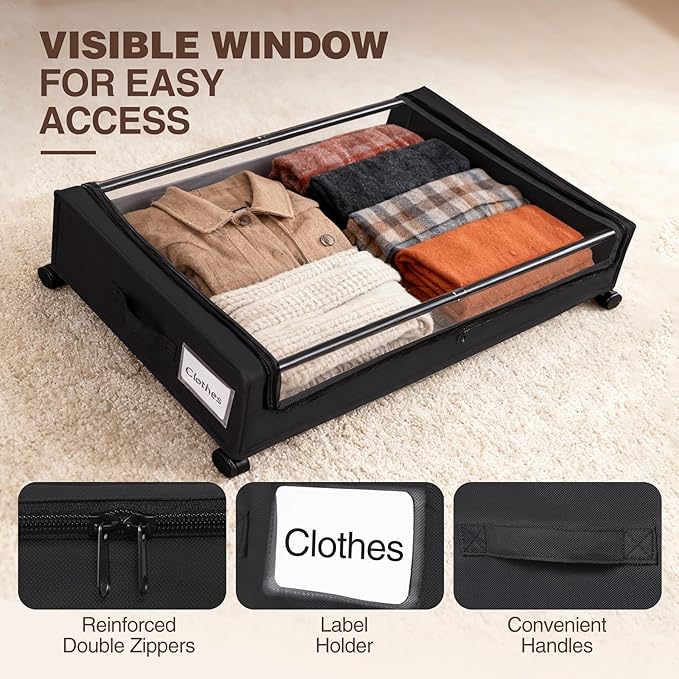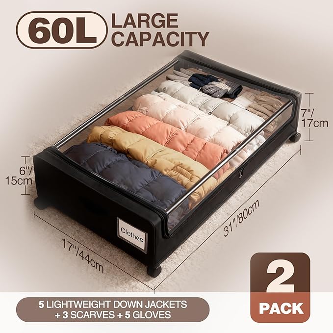Under Bed Storage with Wheels, 2 Pack Under bed Storage Containers, XXL 60L Rolling Under Bed Drawers on wheels for Clothes, Shoes, Blankets in Bedroom, Dorm, Black