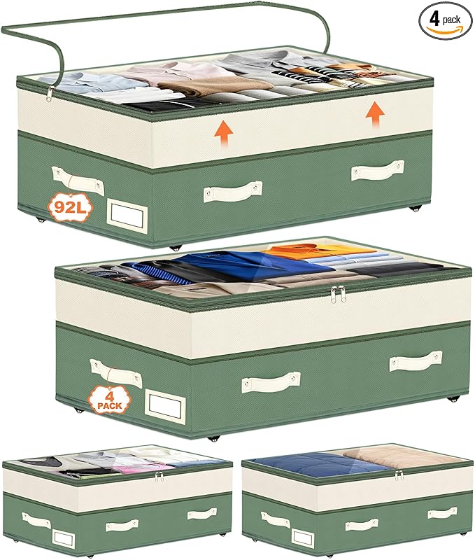Dolicer 4 Pack Under Bed Storage with Wheels, 6in-10in Height Adjustable Underbed Storage Containers, 92L XXXL Under Bed Drawers Rolling Bin with Clear Lids for Dorm Shoes Clothes Organizers(Green)