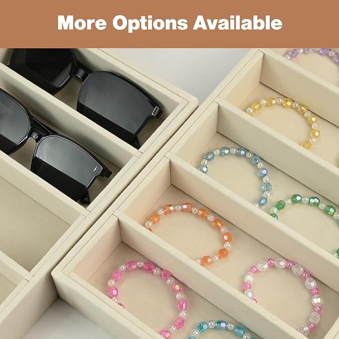 - 【Efficient Stackable Storage for Multiple Items】Sunglass organizer Designed for maximum efficiency, this stackable glasses storage tray. Includes 1premium velvet trays (15"x7.5"x1.77" inch) with 6 compartments per tray, offering space for 8+ pairs of sunglasses or a mix of eyewear, watches & jewelry, the 8 compartments provide ample space for all your accessories, sunglasses organizer drawer making it an ideal eyeglass organizer for multiple glasses.