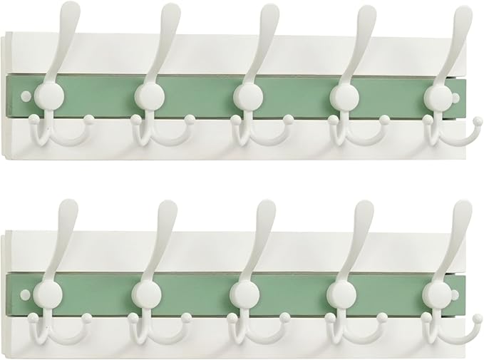 SKOLOO Coastal Wall Mounted Coat Rack - 16-7/8" Beach House Entryway Wooden Coat Hook with 5 Hooks for Hanging Coats, Hats or Towels, Oceanfront Cottage Core Collection, White & Green, Pack of 2