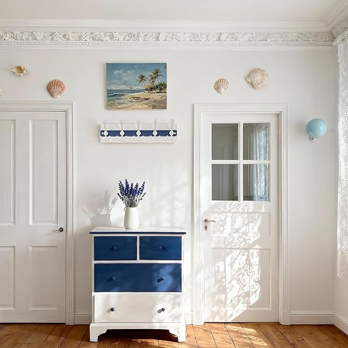- 【Coastal Cottage Core Aesthetic】Embrace the serene vibes of oceanfront living with our Beach House Collection wall coat rack. The charming White & Blue color combo evokes sandy shores and tropical sunsets, perfectly capturing the Cottage Core spirit to infuse your space with a relaxed, coastal charm.