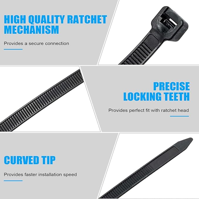 - Exceptional Material Quality: these black zip ties are crafted from nylon 66, they are UV resistant, adding a layer of protection against harsh sunlight, while also offering fire and frost resistance; These attributes make them ideal for challenging weather conditions, be it snowy winters or bright, sunny days, proving to be a practical choice for diverse environments