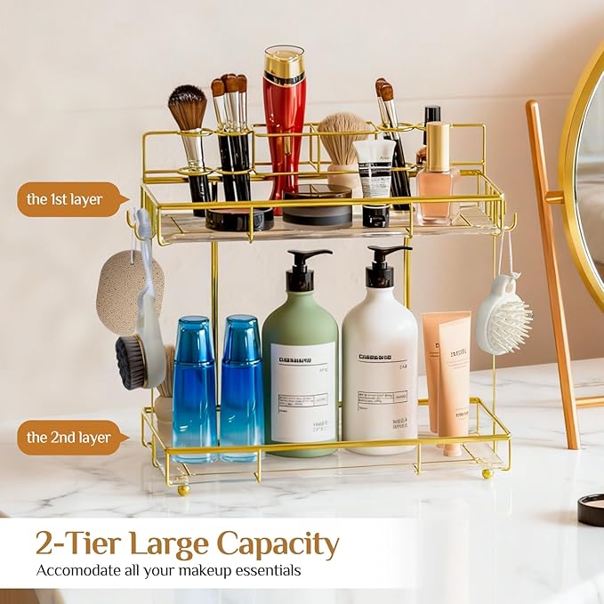 - Quality materials and stylish design: Skin care products storage rack we use all-metal frame + ABS tray, 2 layer design, the upper and lower layer spacing heightened, suitable for different sizes of tall bottles, thickened metal for a long time without fading durable, metal frame force balanced, sturdy and durable, not afraid of moisture and corrosion.