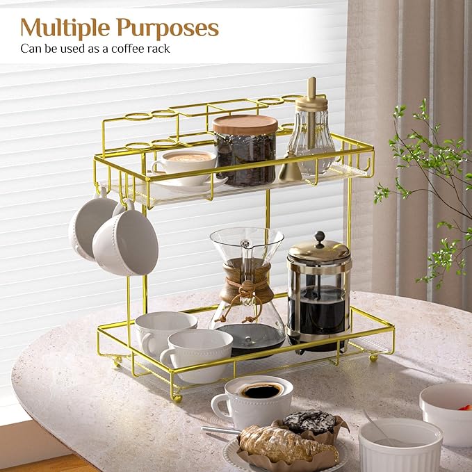 2 Tier Golden Bathroom Organizer Countertop, Small Countertop Organizer for Bathroom Decor, Kitchen Counter Shelf for Spice Rack and Snack, Vanity Makeup Organizers and Storage Tray for Bedroom