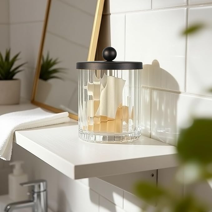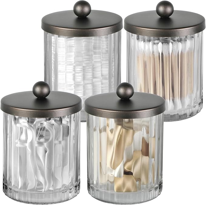 - Durable Premium Quality - This qtip holder dispenser are crafted from thick glass, these apothecary jars block some lighting to protect sensitive items (like essential oils or bath salts). The steel lids are coated to prevent tarnishing, ensuring they stay beautiful for years. Unlike flimsy plastic organizers, these jars won't stain, warp, or break easily. They're also easy to clean—just wipe with a damp cloth. A small investment for a lifetime of elegant storage.