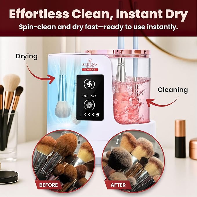 - One-Button Hands-Free Cleaning Makeup Brush Washer: No assembly,batteries,manual scrubbing. Just add water and cleanser press the button and let the automatic makeup brush cleaner machine take over. Cleaning and drying functions can run simultaneously to save time