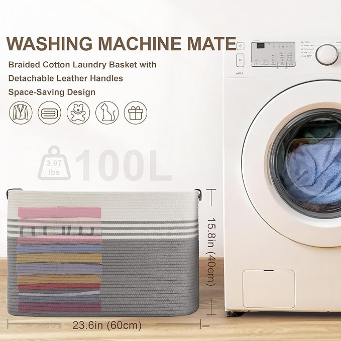 100L Extra Large Laundry Basket with Leather Handles for Living Room Storage, Woven Rope Baskets for Blanket, Kids Toy, Gifts, Wicker Hamper for Bedroom Dirty Clothes, 24"x16"x16" White Grey