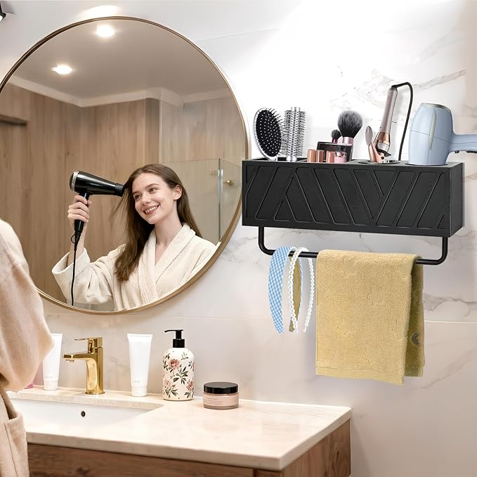 - 【Hair Tool Organizer with Towel Bar】Not only does our hair dryer holder wall mounted for bathroom storage feature a dedicated space, but it also comes with a sturdy towel bar. The towel bar of hair styling tools organizer can be easily installed in various ways, allowing you to customize the flat iron holder to suit your specific needs. Our innovative bathroom organizer design can simultaneously store cosmetic, towel, hair dryer, straightener, etc. It's ideal for your bathroom, restroom
