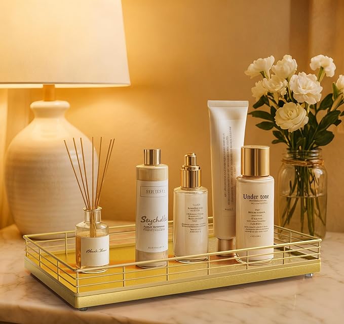 - Larger 13" × 8" Upgraded Size: Designed wider than standard trays, the 13" × 8" surface offers generous space for organizing and displaying essentials. Ideal for perfume bottles, skincare, candles, diffusers, and decorative accents on bathroom vanities or countertops